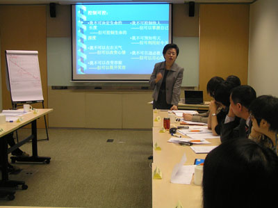 2008年4月28日迈道国际公司高级培训师常老师成功的为某国际著名证券公司的员工提供了时间管理的培训。常老师以生动的开场白活跃了现场气氛.学员们提出在时间管理上遇到的各种问题:拖沓;忘掉细节;突发事件多,做好的计划无法按时完成,工作效率低而经常加班等等.老师使用丰富的案例,游戏,影片使学员全程高度参与.深刻体会了时间管理的重要性,掌握了提高效率的时间管理工具及提升效能的时间管理思路和方法.学员们一致反映深受启发,承诺课后制定并实施时间管理计划,应用课上所学.迈道国际公司会在21天内跟进检查学员的应用情况。